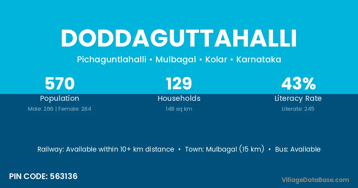 Mulbagal (15 km) is the nearest town to Doddaguttahalli village for major economic activities and is located approximately 15 km away.