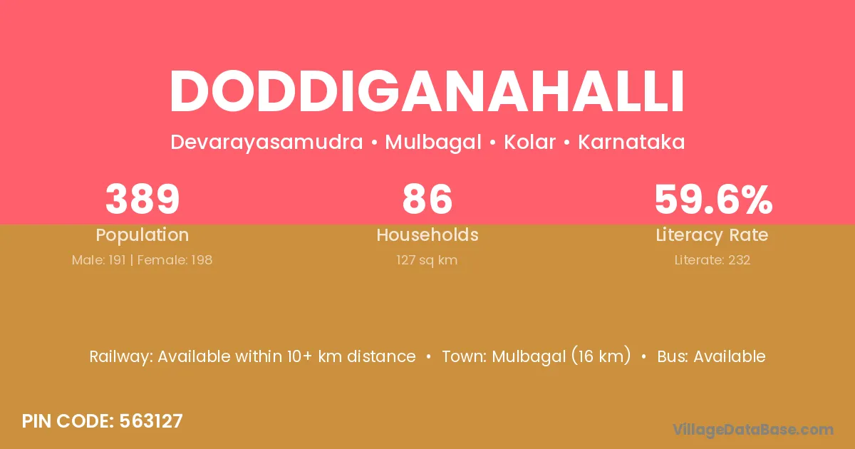 Mulbagal (16 km) is the nearest town to Doddiganahalli village for major economic activities and is located approximately 16 km away.