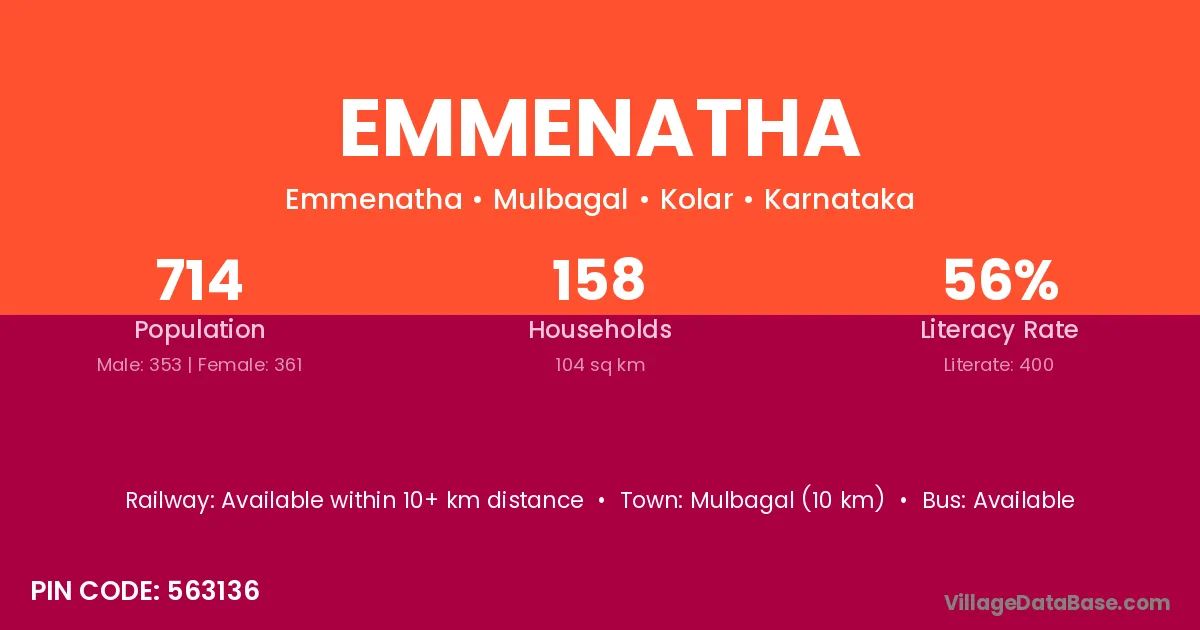 Mulbagal (10 km) is the nearest town to Emmenatha village for major economic activities and is located approximately 10 km away.