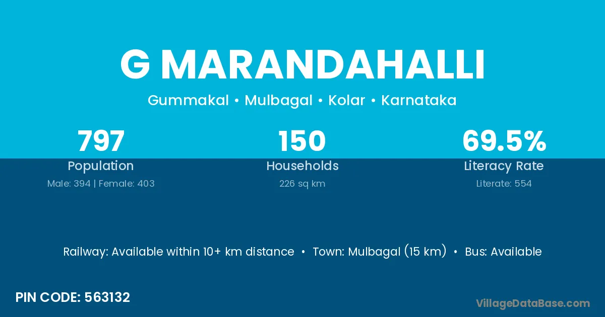 Mulbagal (15 km) is the nearest town to G Marandahalli village for major economic activities and is located approximately 15 km away.