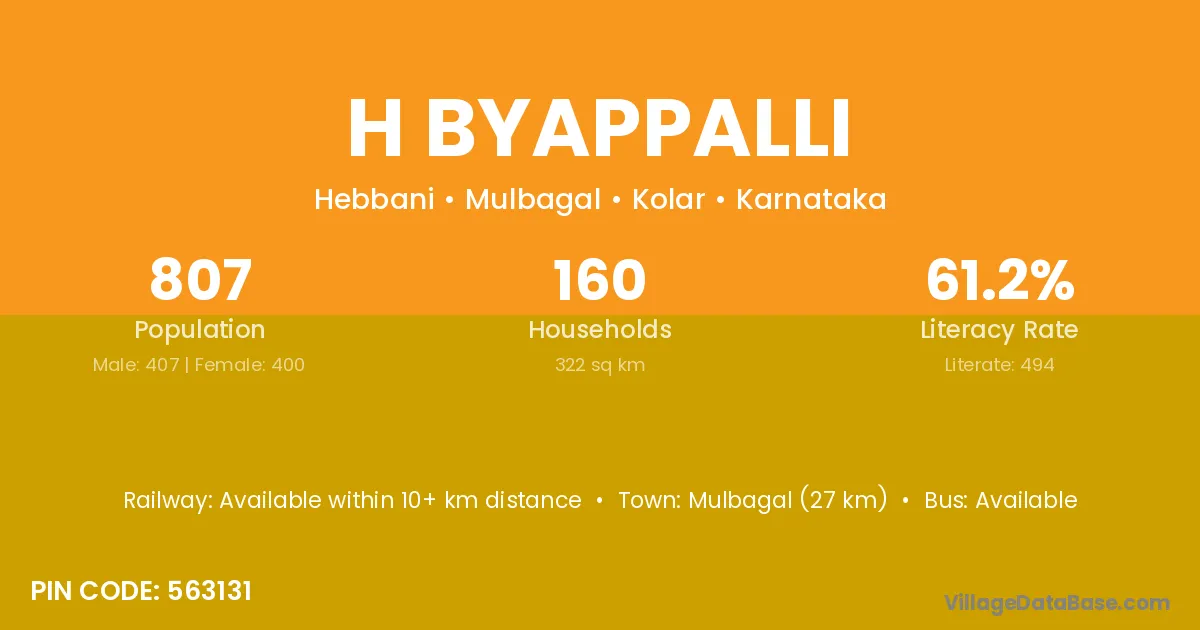 Mulbagal (27 km) is the nearest town to H Byappalli village for major economic activities and is located approximately 27 km away.