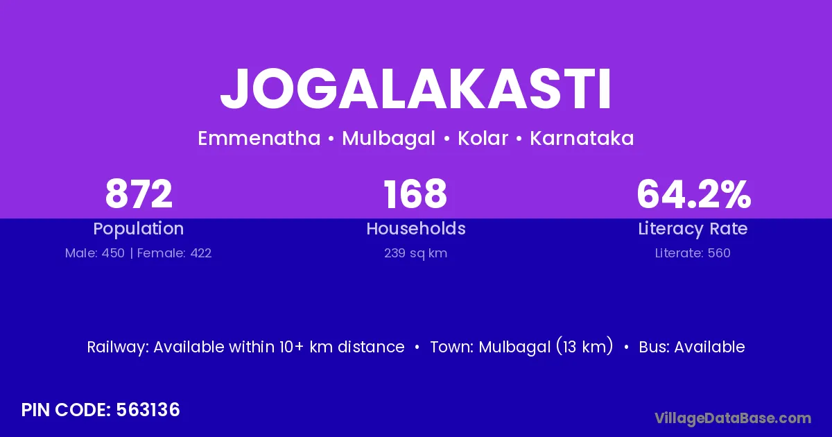 Mulbagal (13 km) is the nearest town to Jogalakasti village for major economic activities and is located approximately 13 km away.