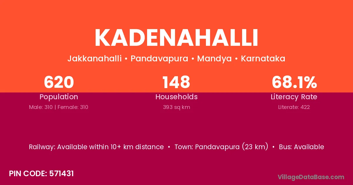 The literacy rate of Kadenahalli village is 60.58%. Male literacy stands at 67.34% and female literacy at 53.91%.