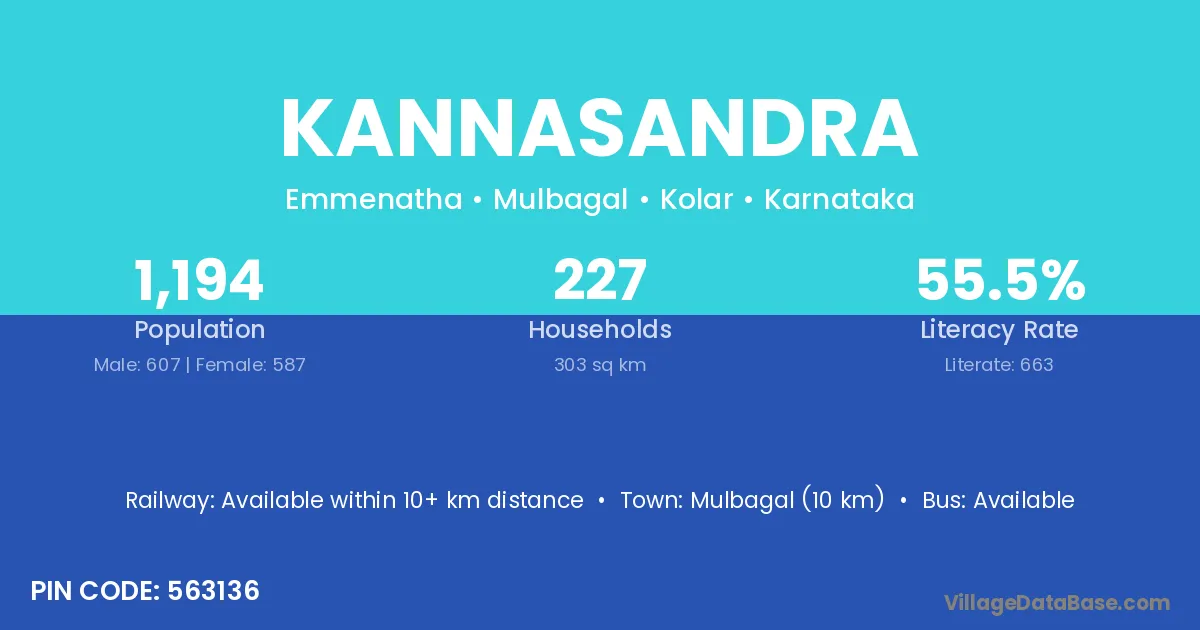 Kannasandra village has a total population of 1,194 people, of which 607 are males and 587 are females.