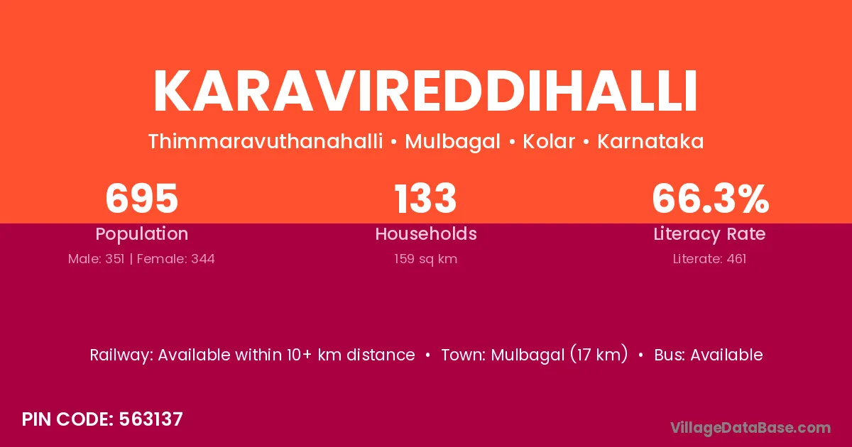 Karavireddihalli village has a total population of 695 people, of which 351 are males and 344 are females.