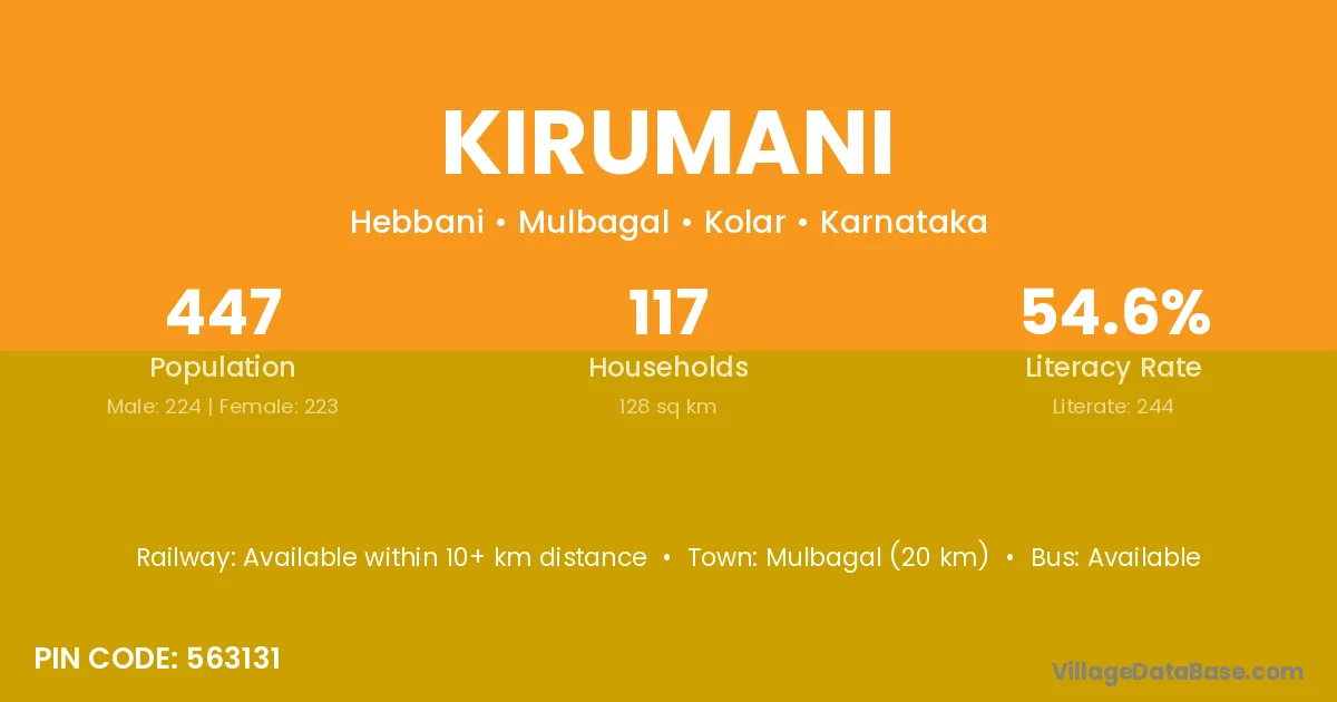 Mulbagal (20 km) is the nearest town to Kirumani village for major economic activities and is located approximately 20 km away.