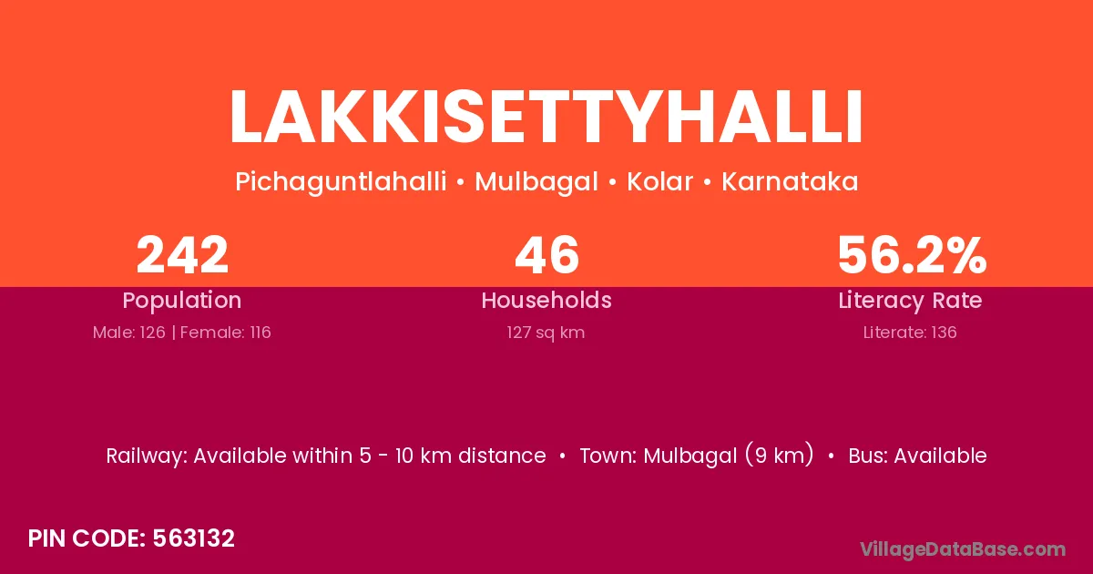 Mulbagal (9 km) is the nearest town to Lakkisettyhalli village for major economic activities and is located approximately 9 km away.