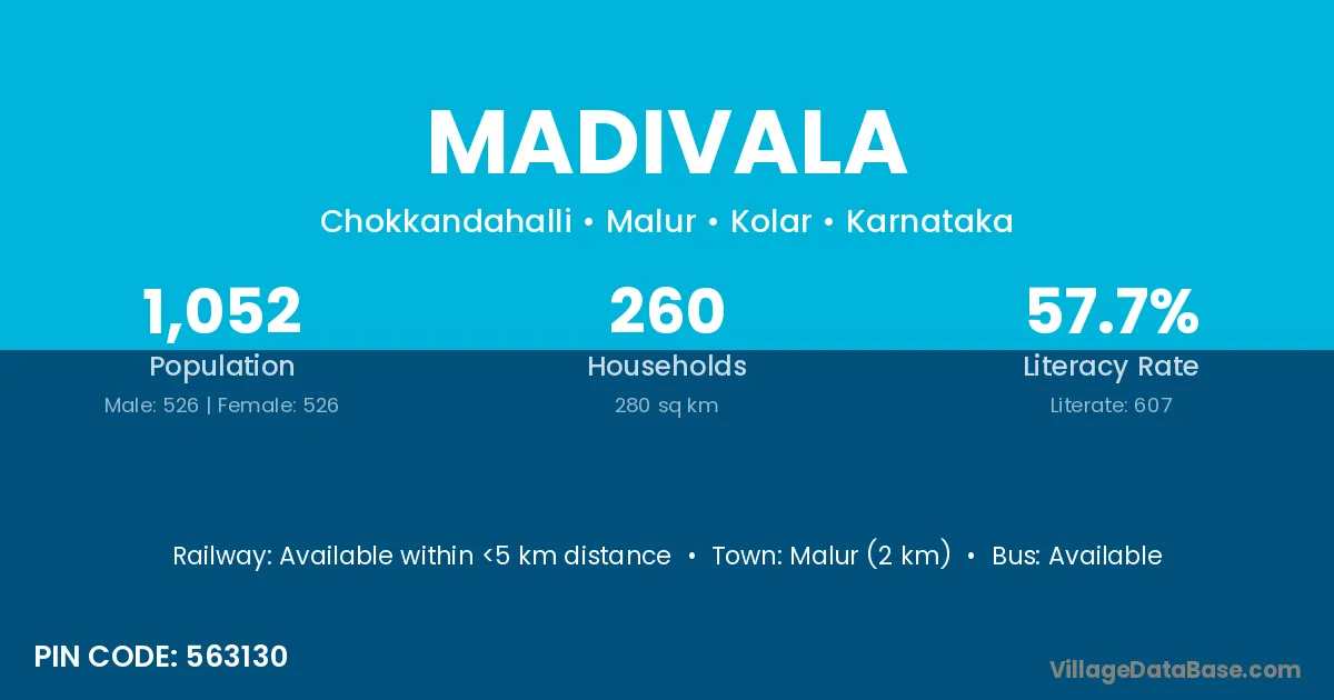 Mulbagal (12 km) is the nearest town to Madivala village for major economic activities and is located approximately 12 km away.