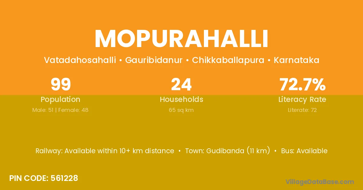 Mulbagal (11 km) is the nearest town to Mopurahalli village for major economic activities and is located approximately 11 km away.