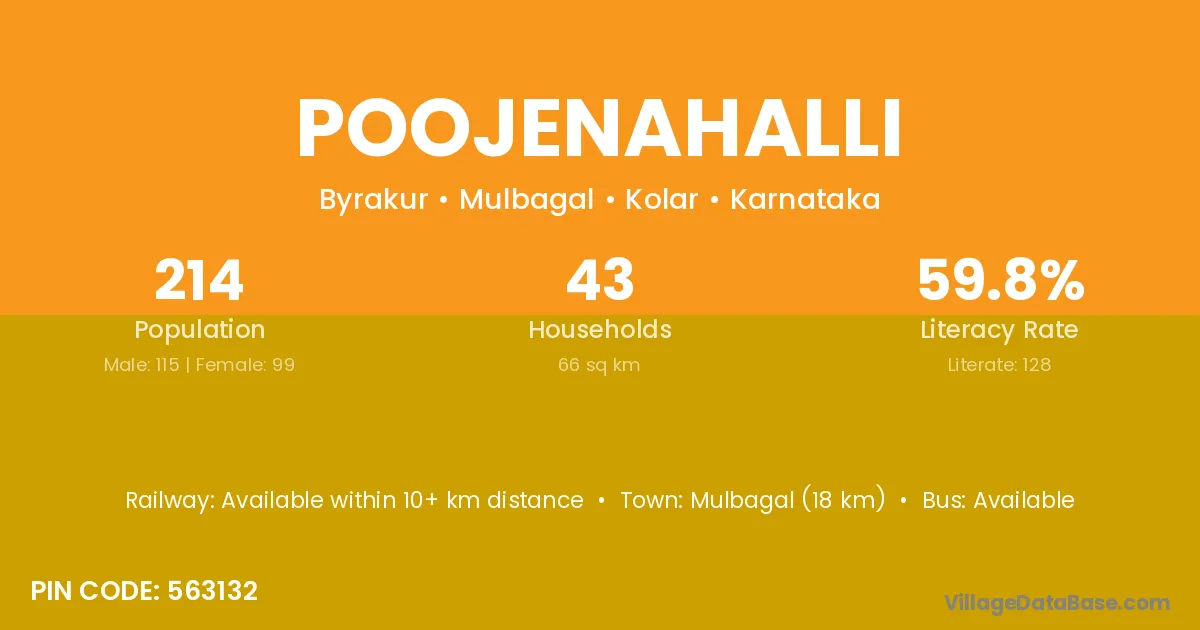 Mulbagal (18 km) is the nearest town to Poojenahalli village for major economic activities and is located approximately 18 km away.
