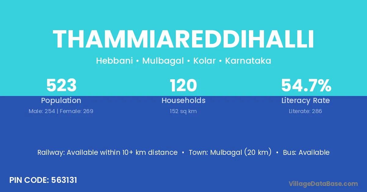 Mulbagal (20 km) is the nearest town to Thammiareddihalli village for major economic activities and is located approximately 20 km away.