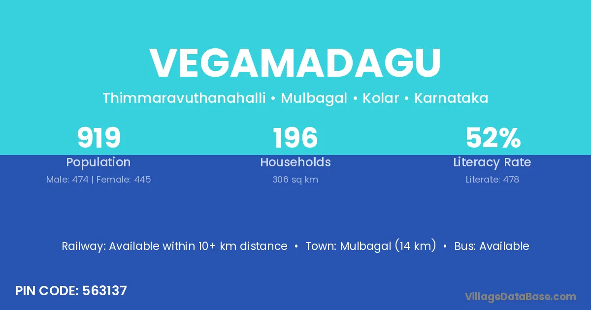 Mulbagal (14 km) is the nearest town to Vegamadagu village for major economic activities and is located approximately 14 km away.