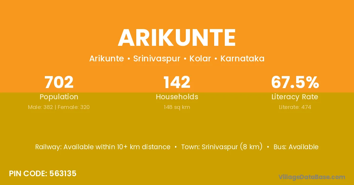 Srinivaspur (8 km) is the nearest town to Arikunte village for major economic activities and is located approximately 8 km away.