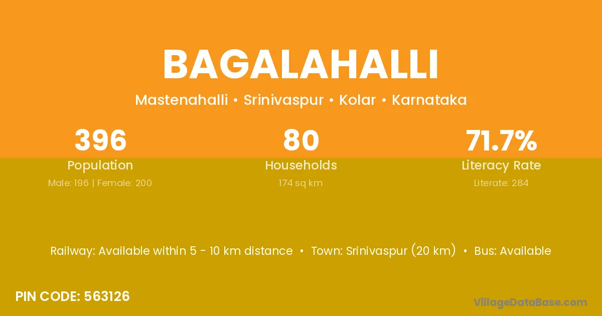 Srinivaspur (20 km) is the nearest town to Bagalahalli village for major economic activities and is located approximately 20 km away.