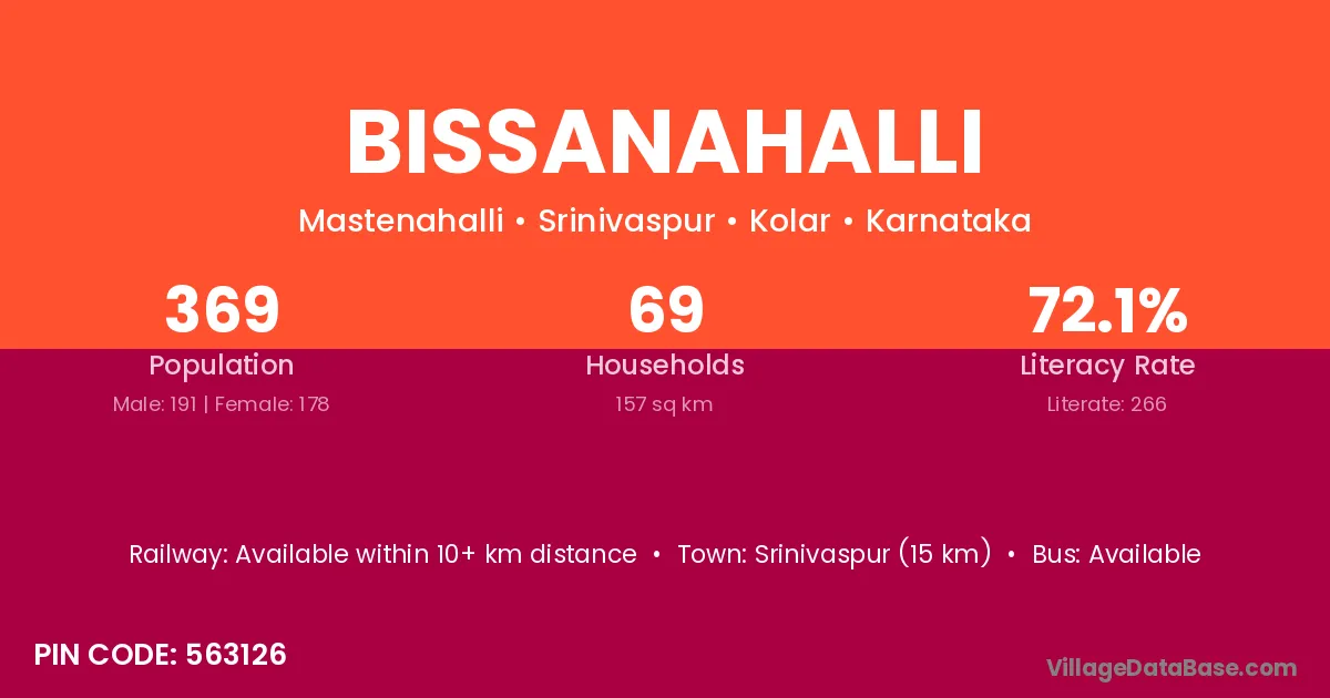 Srinivaspur (15 km) is the nearest town to Bissanahalli village for major economic activities and is located approximately 15 km away.