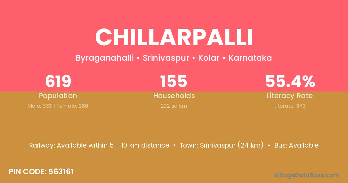 Srinivaspur (24 km) is the nearest town to Chillarpalli village for major economic activities and is located approximately 24 km away.