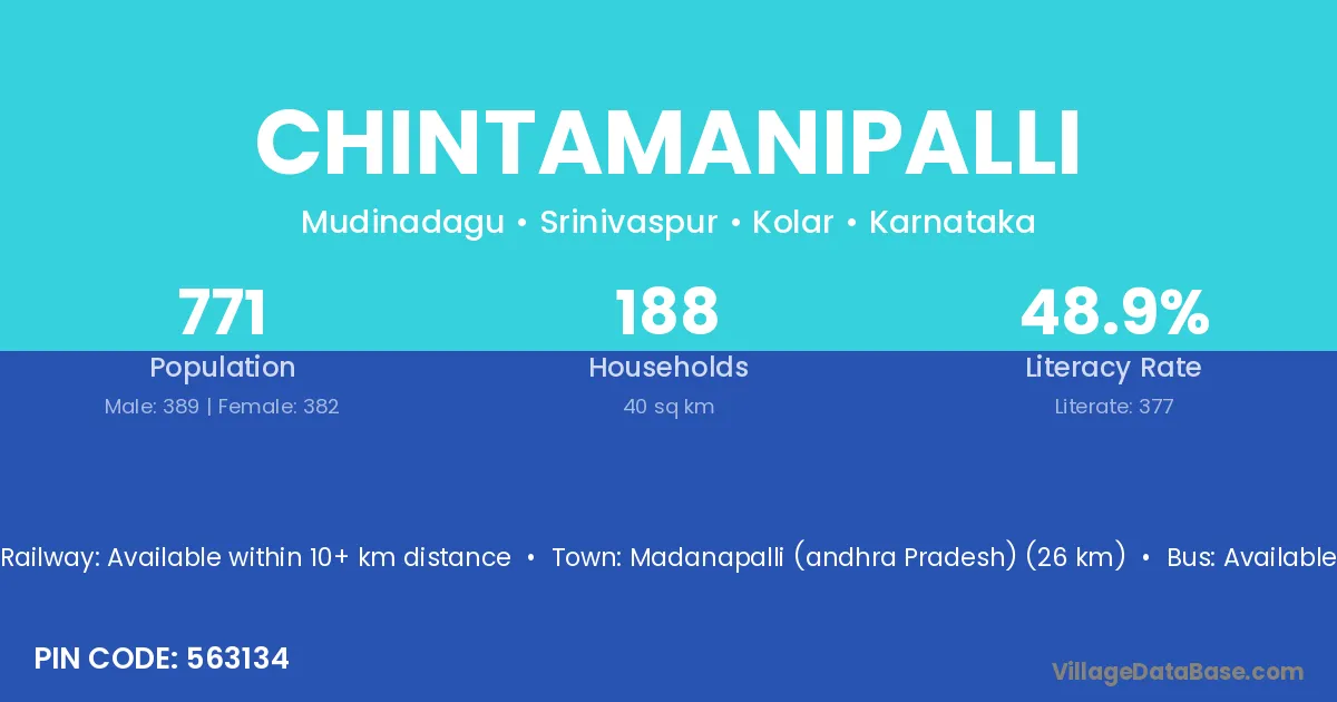 Chintamanipalli village has a total population of 771 people, of which 389 are males and 382 are females.