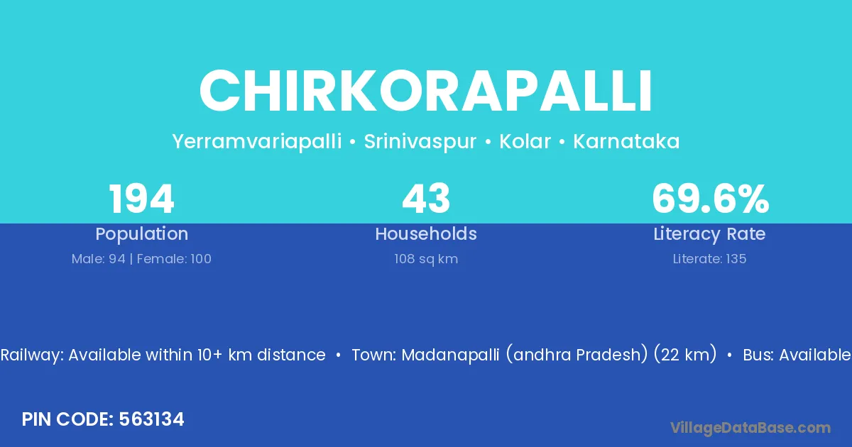 Madanapalli (andhra Pradesh) (22 km) is the nearest town to Chirkorapalli village for major economic activities and is located approximately 22 km away.