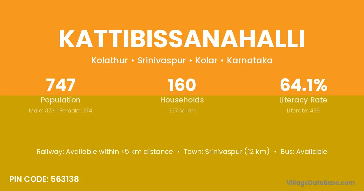 Srinivaspur (12 km) is the nearest town to Kattibissanahalli village for major economic activities and is located approximately 12 km away.