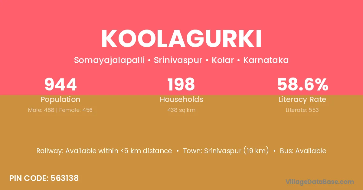 Srinivaspur (19 km) is the nearest town to Koolagurki village for major economic activities and is located approximately 19 km away.