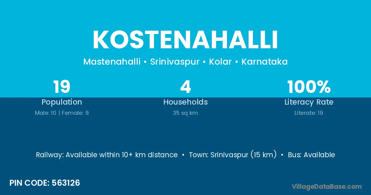 Kostenahalli village has a total population of 19 people, of which 10 are males and 9 are females.