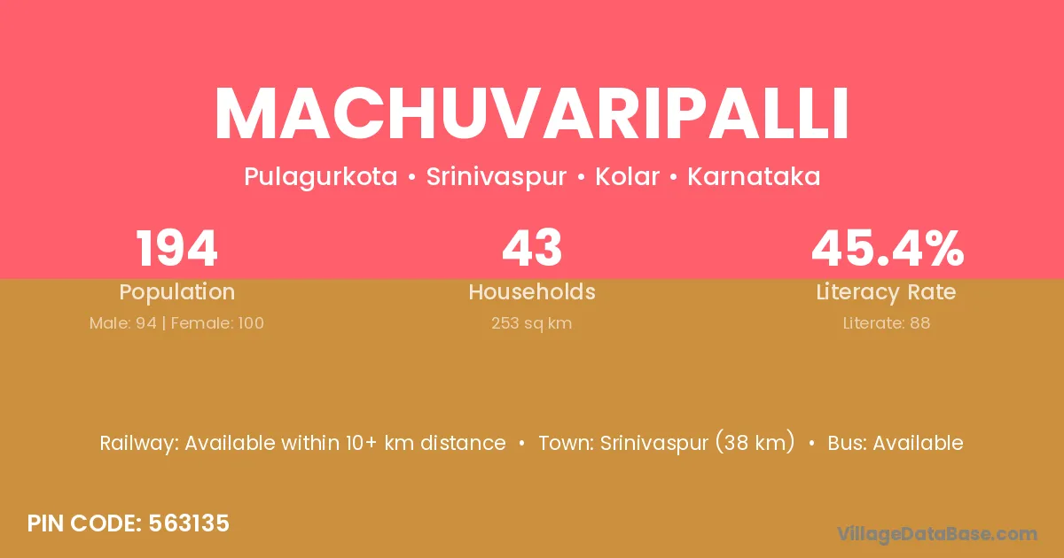 Srinivaspur (38 km) is the nearest town to Machuvaripalli village for major economic activities and is located approximately 38 km away.