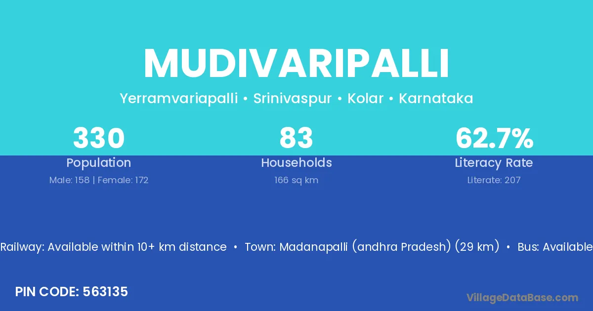 Madanapalli (andhra Pradesh) (29 km) is the nearest town to Mudivaripalli village for major economic activities and is located approximately 29 km away.