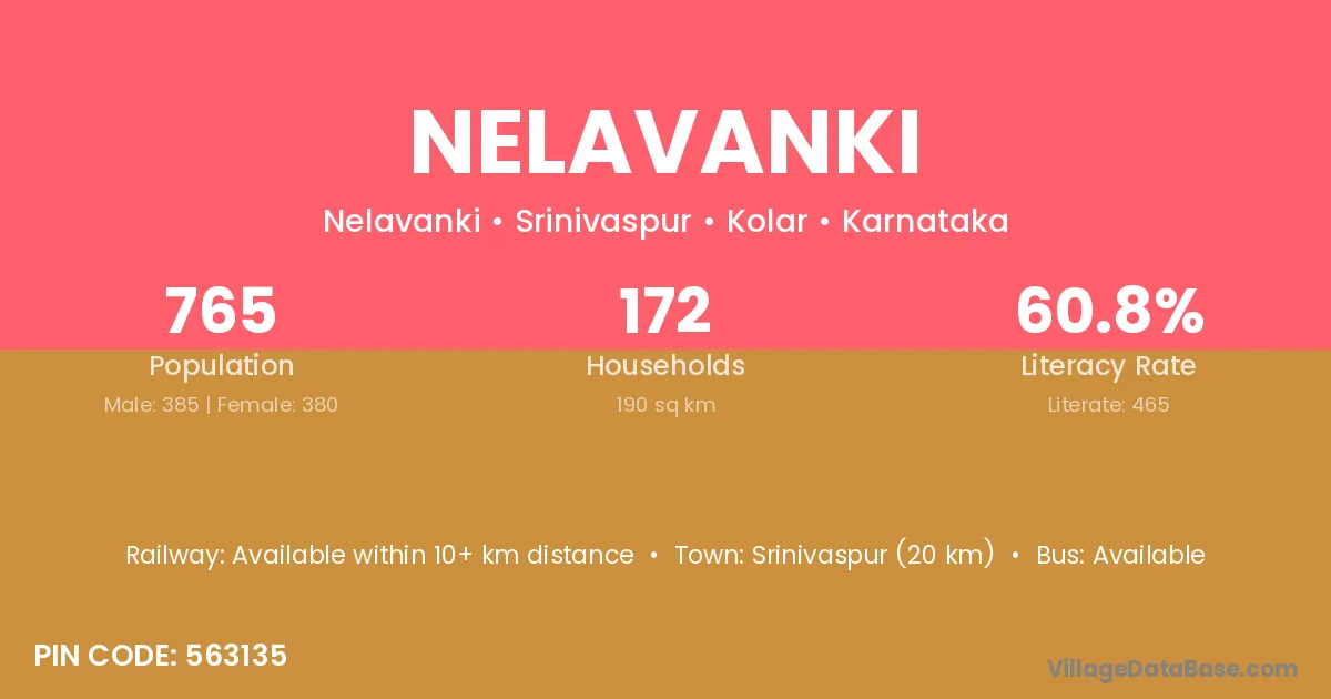 Srinivaspur (20 km) is the nearest town to Nelavanki village for major economic activities and is located approximately 20 km away.