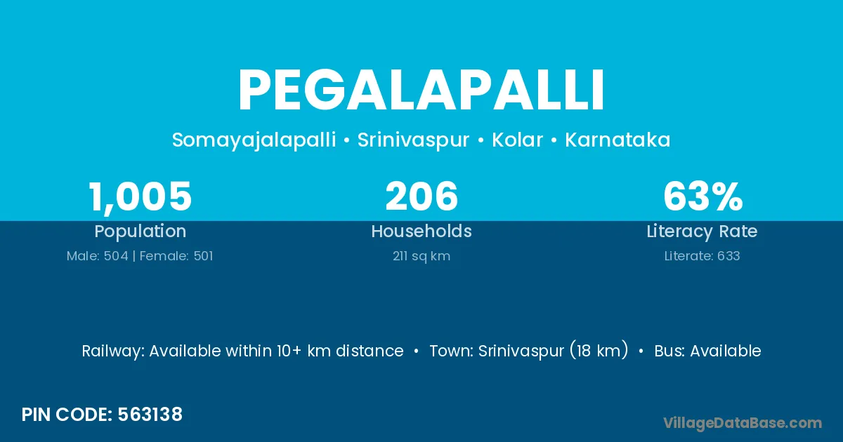 Srinivaspur (18 km) is the nearest town to Pegalapalli village for major economic activities and is located approximately 18 km away.