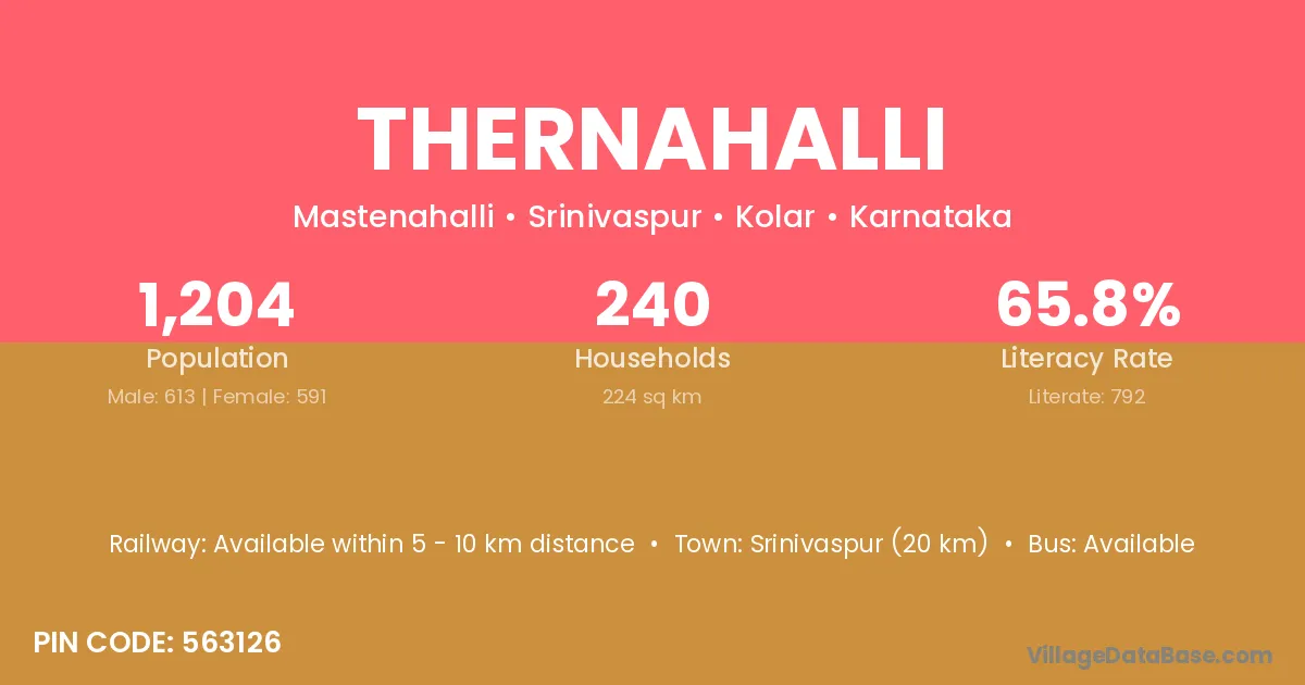 Thernahalli village has a total population of 1,204 people, of which 613 are males and 591 are females.