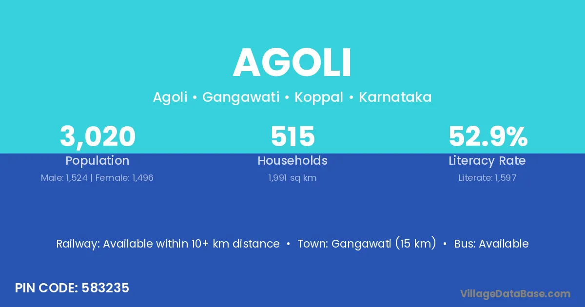 Gangawati (15 km) is the nearest town to Agoli village for major economic activities and is located approximately 15 km away.