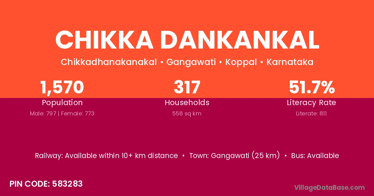 Chikka Dankankal village has a total population of 1,570 people, of which 797 are males and 773 are females.