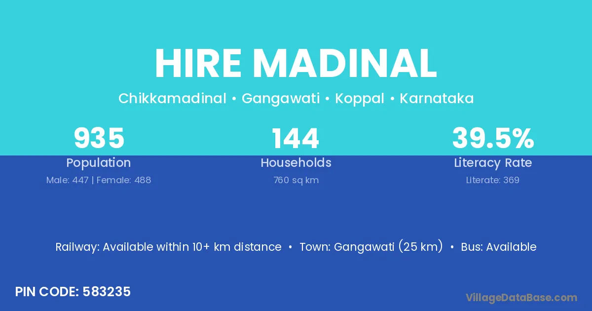 Gangawati (25 km) is the nearest town to Hire Madinal village for major economic activities and is located approximately 25 km away.