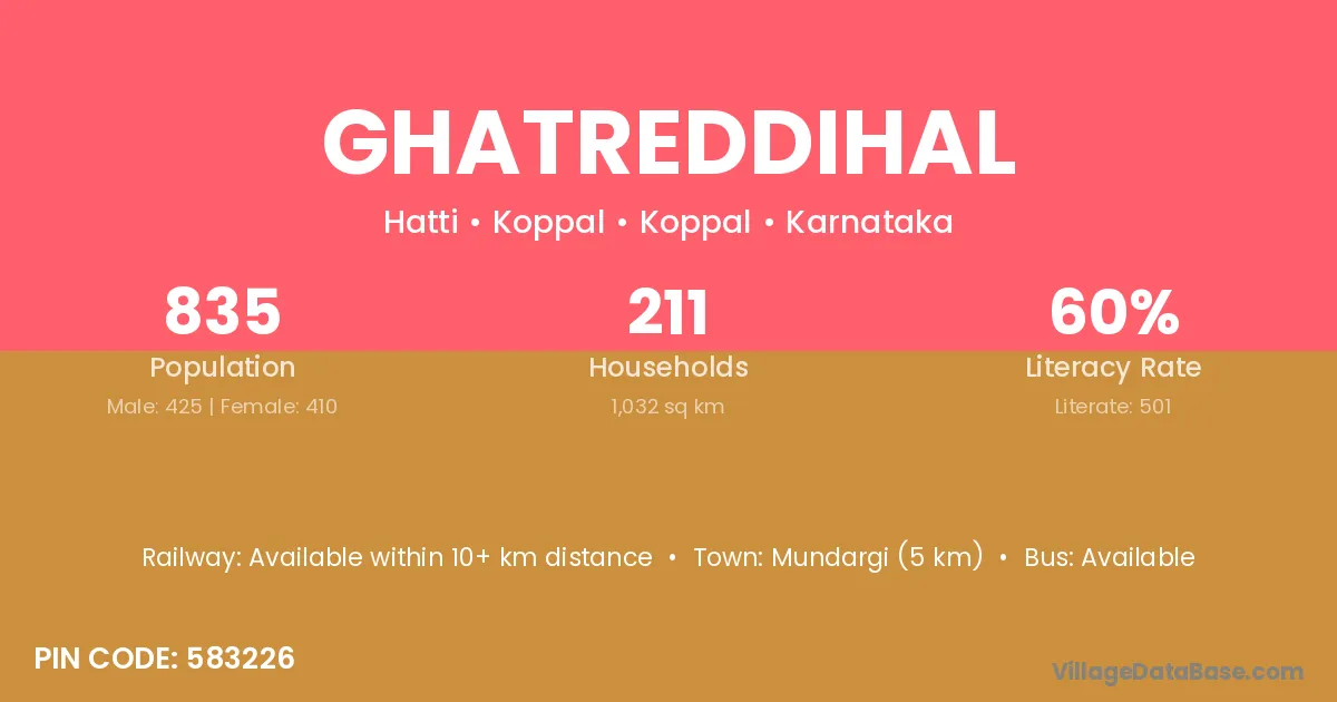 Mundargi (5 km) is the nearest town to Ghatreddihal village for major economic activities and is located approximately 5 km away.