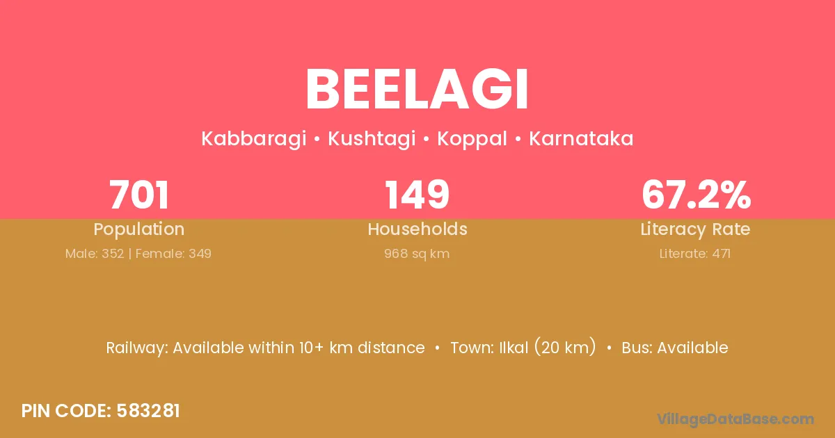 Ilkal (20 km) is the nearest town to Beelagi village for major economic activities and is located approximately 20 km away.