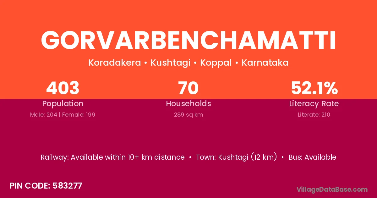 Kushtagi (12 km) is the nearest town to Gorvarbenchamatti village for major economic activities and is located approximately 12 km away.