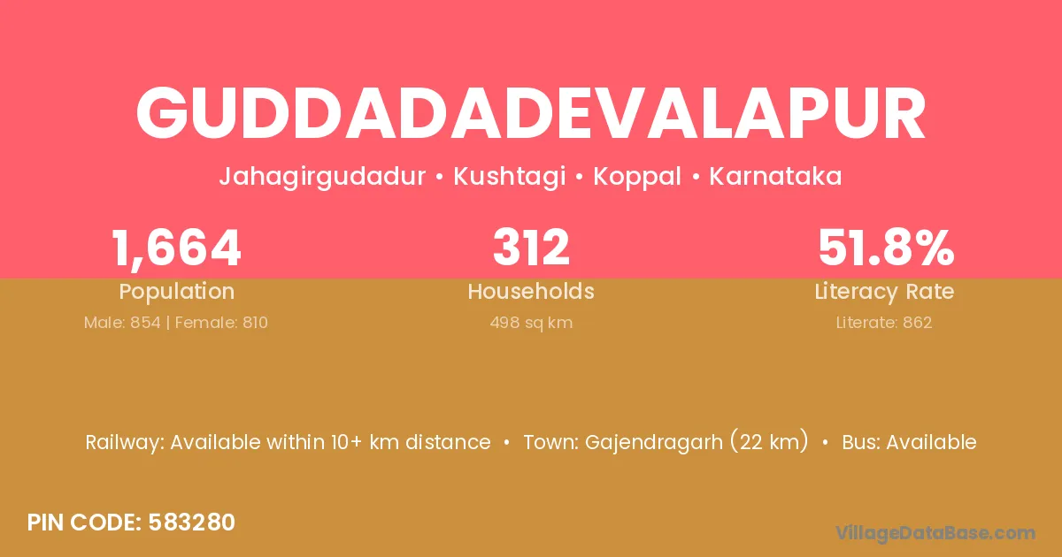 Guddadadevalapur village has a total population of 1,664 people, of which 854 are males and 810 are females.