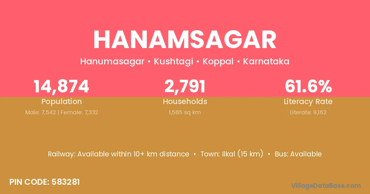 Ilkal (15 km) is the nearest town to Hanamsagar village for major economic activities and is located approximately 15 km away.