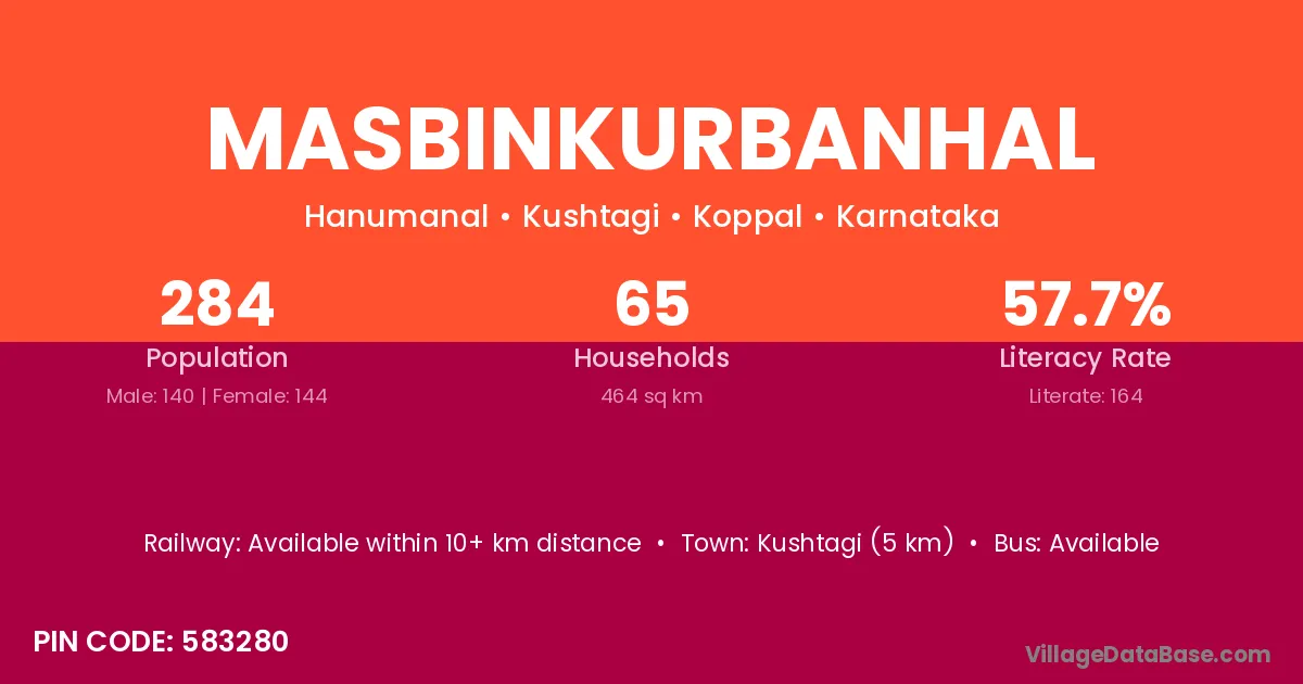 Kushtagi (5 km) is the nearest town to Masbinkurbanhal village for major economic activities and is located approximately 5 km away.