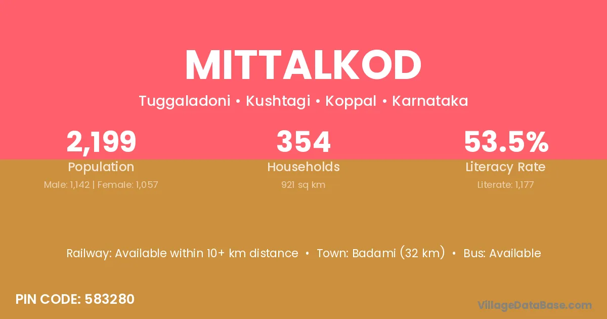 Badami (32 km) is the nearest town to Mittalkod village for major economic activities and is located approximately 32 km away.