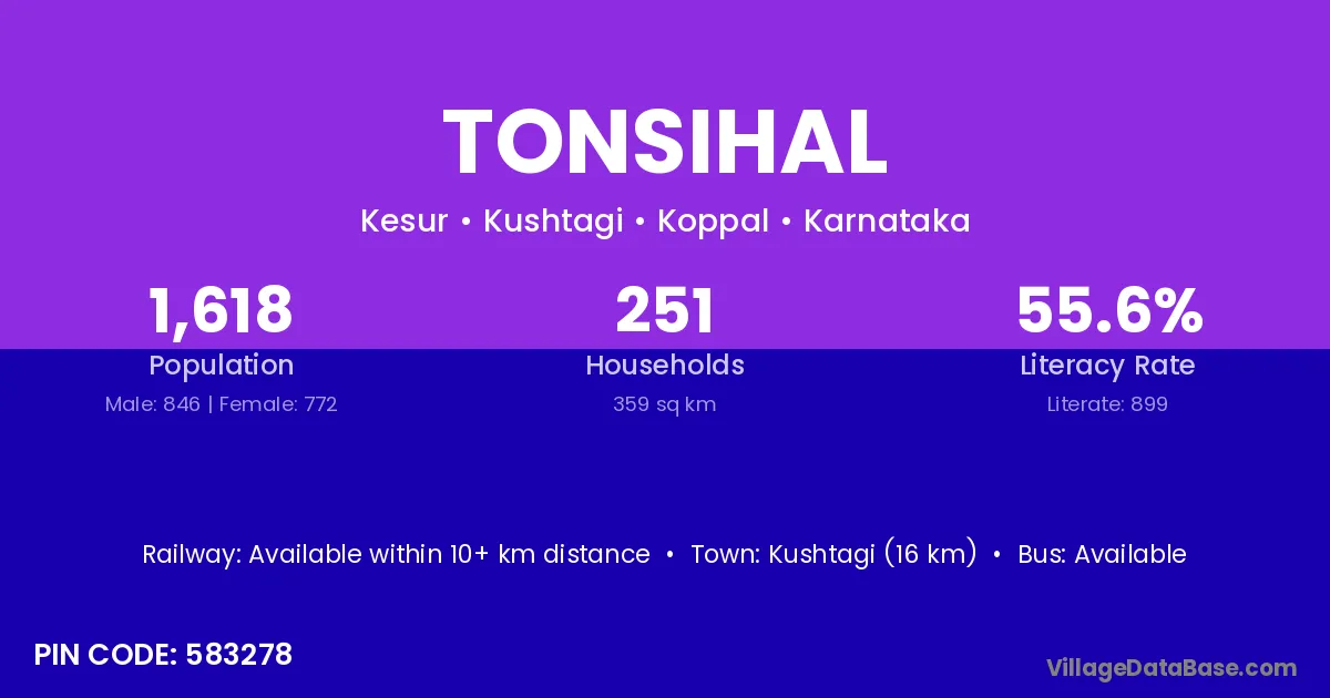 Kushtagi (16 km) is the nearest town to Tonsihal village for major economic activities and is located approximately 16 km away.