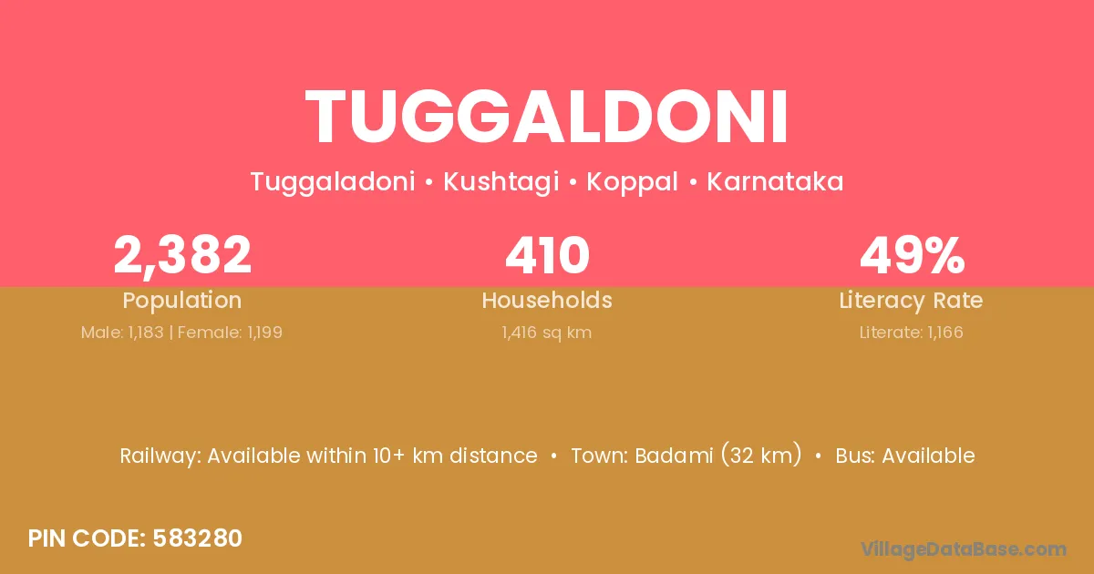 Badami (32 km) is the nearest town to Tuggaldoni village for major economic activities and is located approximately 32 km away.