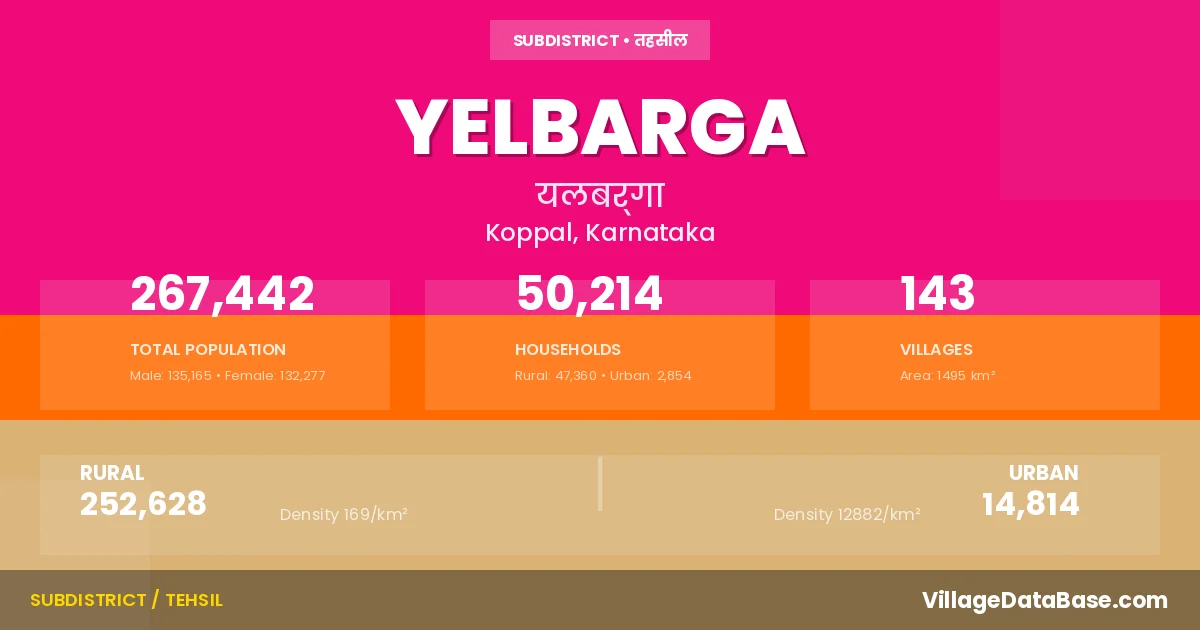 According to the 2011 census The total area of Yelbarga Taluka is 1495 km², with a population of 267442 people. The population density is 179 inhabitants per square kilometre, and there are approximately 50214 houses in the sub district.