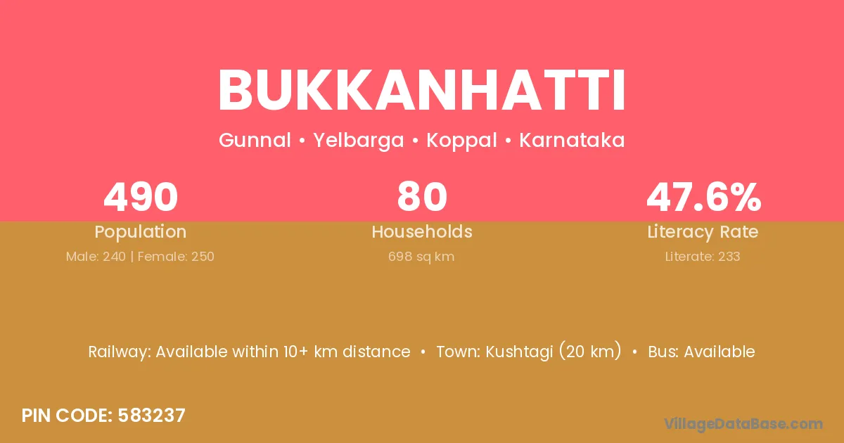 Kushtagi (20 km) is the nearest town to Bukkanhatti village for major economic activities and is located approximately 20 km away.
