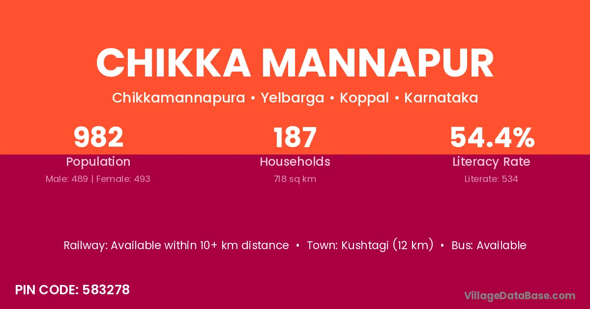 Chikka Mannapur village has a total population of 982 people, of which 489 are males and 493 are females.