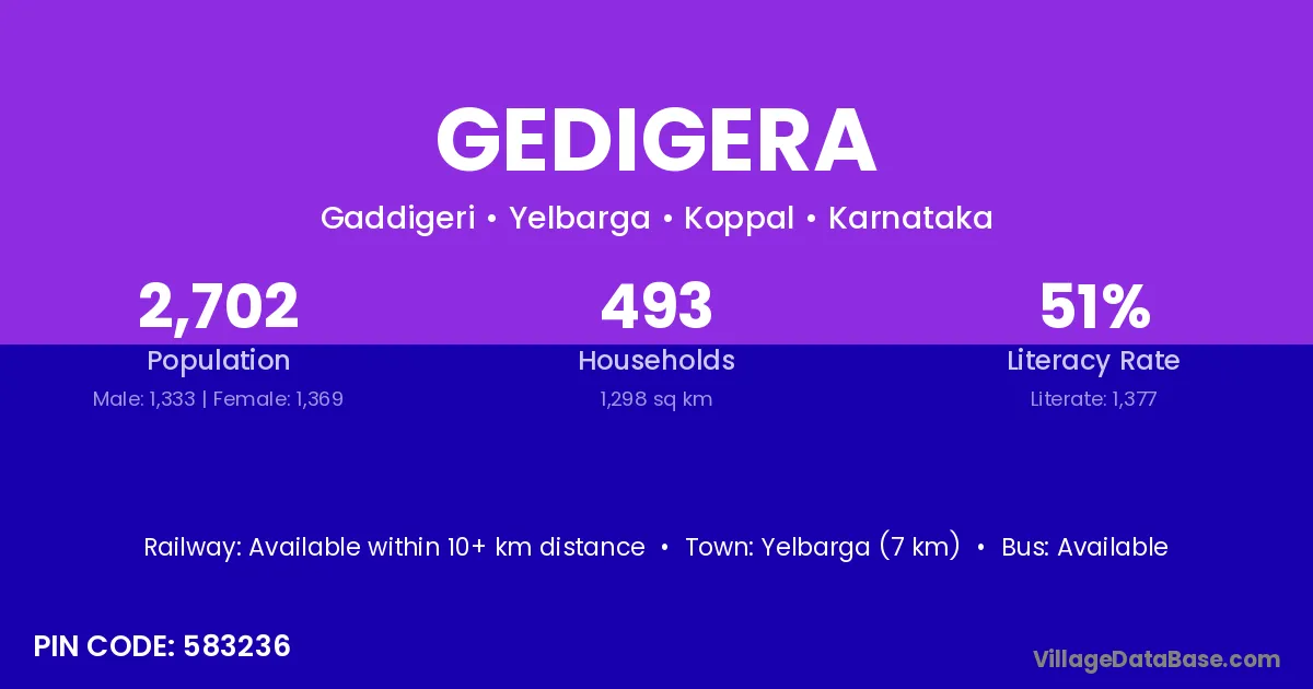 Yelbarga (7 km) is the nearest town to Gedigera village for major economic activities and is located approximately 7 km away.