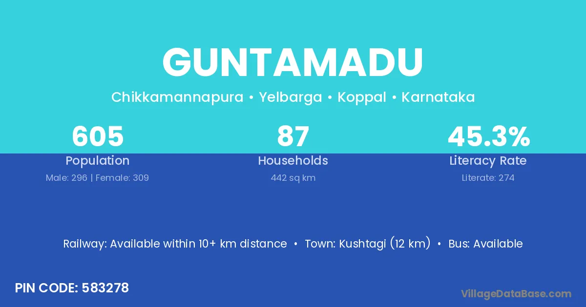 Kushtagi (12 km) is the nearest town to Guntamadu village for major economic activities and is located approximately 12 km away.
