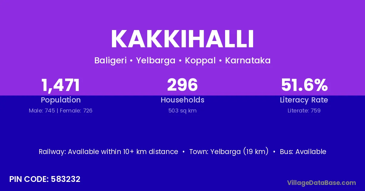 Yelbarga (19 km) is the nearest town to Kakkihalli village for major economic activities and is located approximately 19 km away.