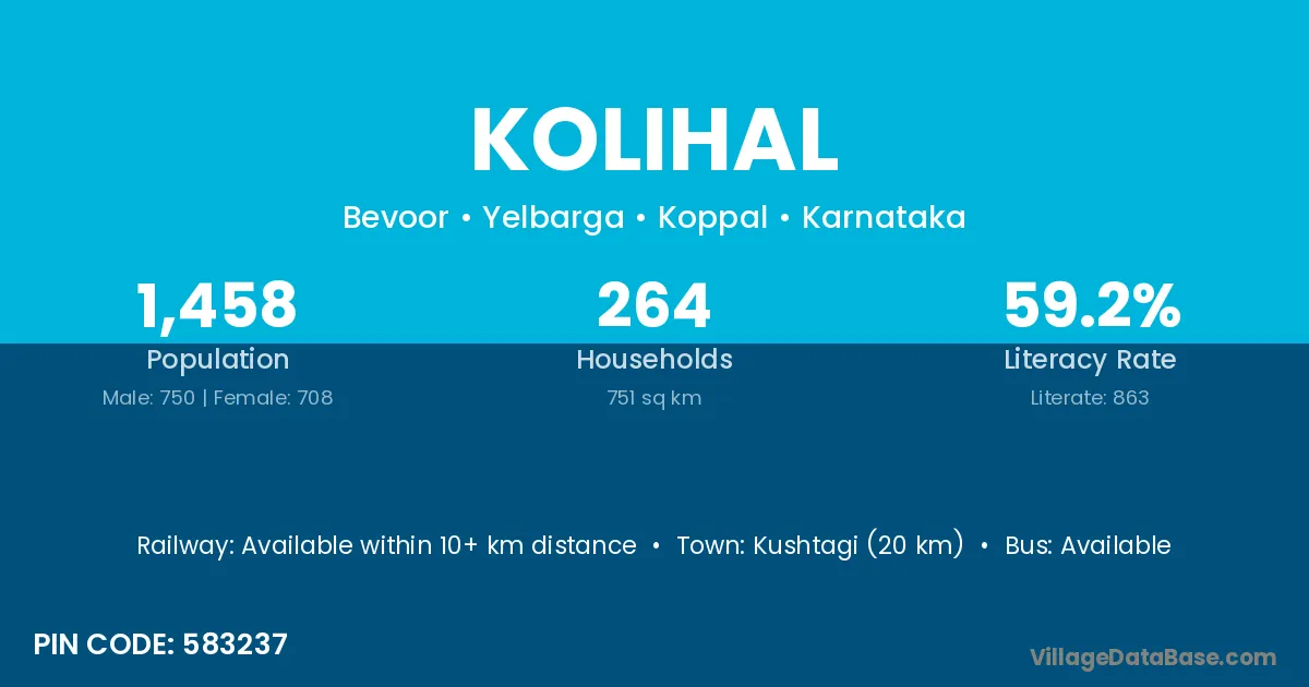 Kushtagi (20 km) is the nearest town to Kolihal village for major economic activities and is located approximately 20 km away.