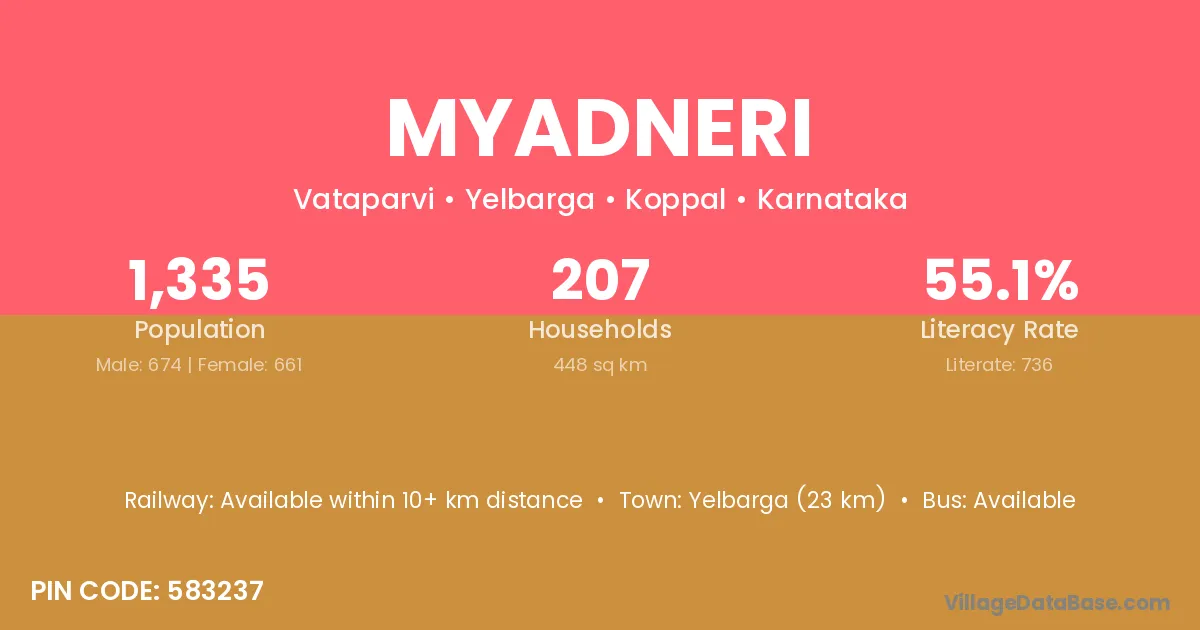 Yelbarga (23 km) is the nearest town to Myadneri village for major economic activities and is located approximately 23 km away.